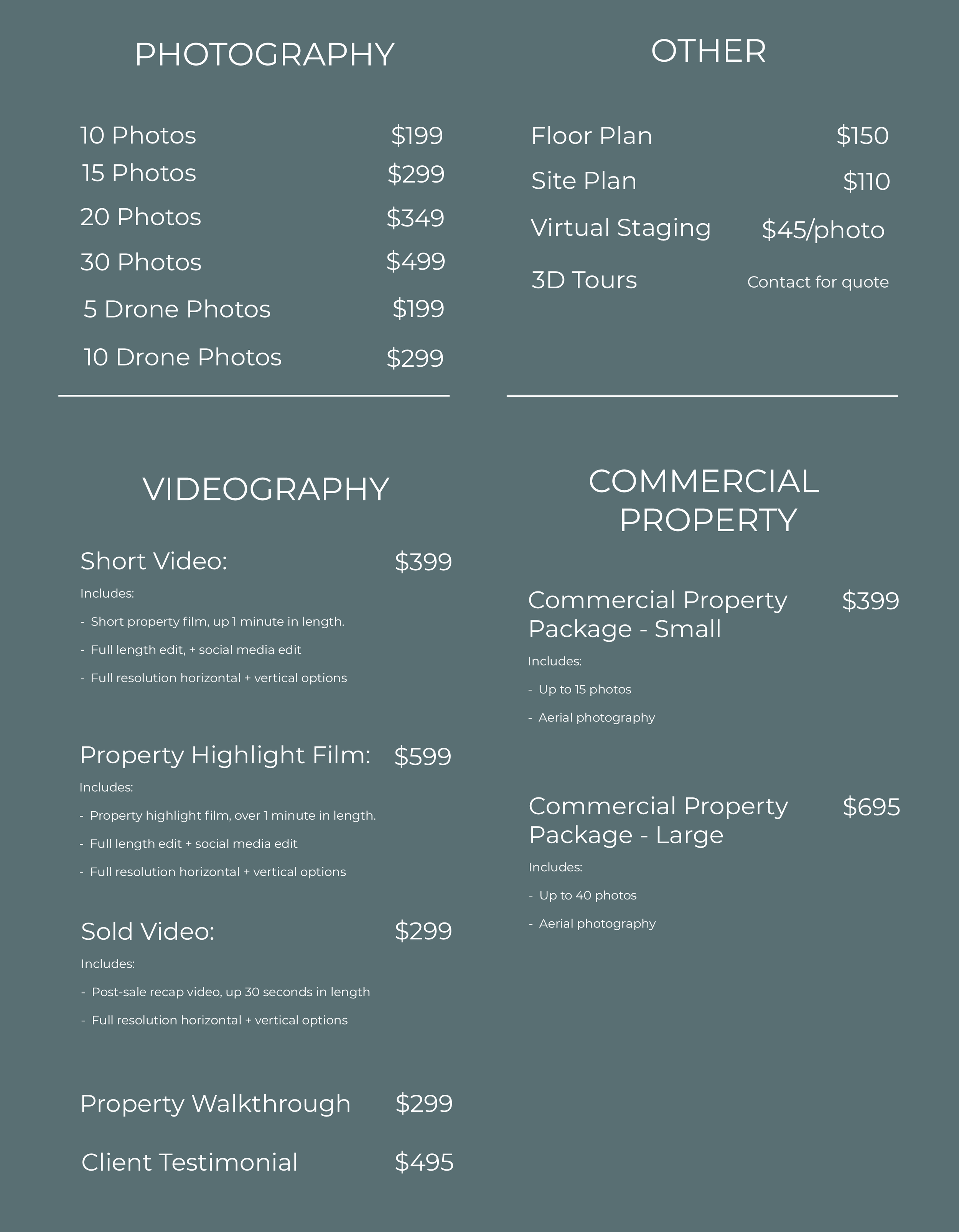If one of our pre-built packages isn’t exactly what you are after, you can combine a range of individual services or contact us for a custom quote.